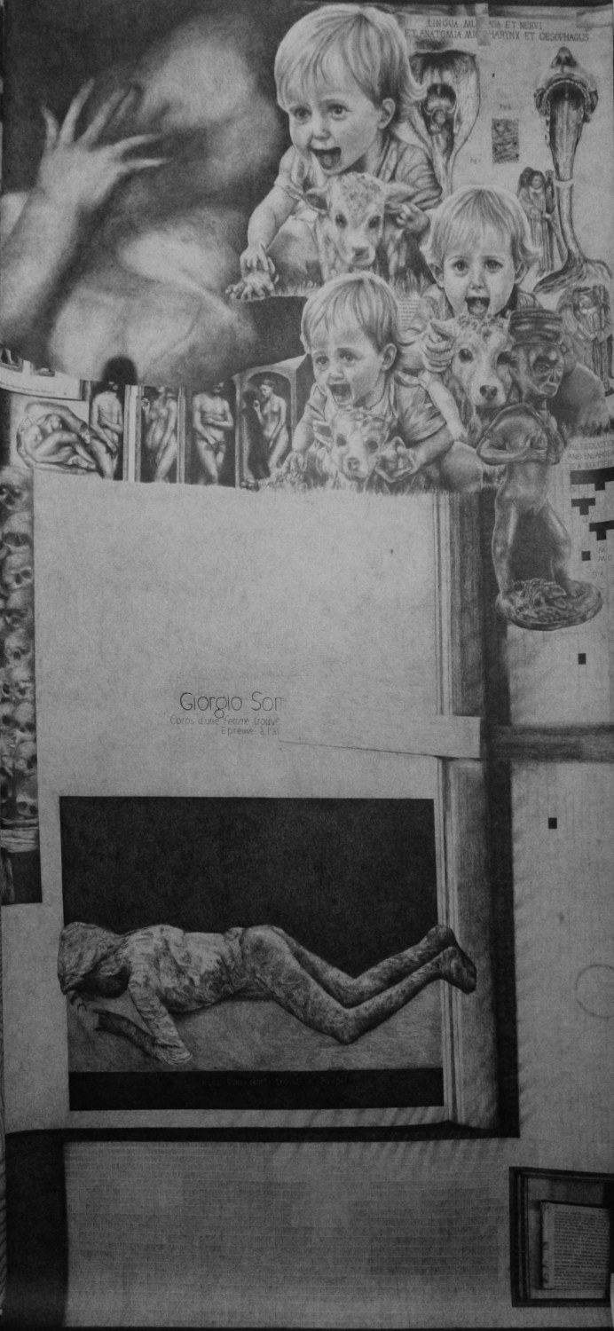 « Le travail de Julie Osko utilise majoritairement « Mine De Plomb » (mine noire) comme titre de ses dessins, laissant un plus grand vide sur toute retenue interprétative de l’imagerie. En même temps qu’il affirme son matérialisme de base – plomb – dépourvu de luxe, il y a une anti-décadence obtenue à travers le processus excessif de rendu des images à travers le corps sur papier, un vide d’horreur d’organisation visuelle. Ceci, associé aux images représentant des corps déformés, lacérés, contraints et décorés dans les limites de la composition, amplifie les qualités indiscernables du paysage et de ceux qui le peuplent, le paysage sublimant ce dernier dans son objectité. Une tension envahit le spectateur avec un respect pour le monument, un sentiment d’être submergé et éclipsé, vers une série de paysages infernaux formant de nouvelles compositions tout en régurgitant des extraits de peintures historiques ou des thèmes de violence partiellement déchiffrés reproduits par la main de l’artiste. Un tout/une composition est suggéré à travers l’uniformité du plomb sur papier, tandis que l’imagerie semble rejeter ses combinaisons et organisations d’informations visuelles autant que les déformations et dégradations représentées. Une marque du « réel surréaliste », l’essai de Bataille sur le gros orteil etc etc etc, amplifié, un trou noir vide de trompettes sonnant à l’envers, sur-énoncé, placé comme « une cathédrale sur » le bien-être psychique de chacun. Pour réitérer le contraste avec des titres sans nom, l’absence de toute description verbale élaborée en dehors des matériaux utilisés, crée un plus grand sentiment d’horreur, un manque de guide, de se retrouver dans un royaume de non-connaissance. Là où Francis Bacon traitait du confinement et de l’isolement, le travail de Julie Osko crée un plus grand malaise d’être, incapable de discerner où son propre être peut être séparé de sa situation actuelle dans le temps et dans l’espace géographiques. Pour le spectateur, il y a une remise en question consciente de l’autonomie, évoquant un désespoir psychique de définir ce qui nous sépare de ce qui nous repousse, prédominant dans les compositions dessinées. Le malaise de cet attachement indissociable au temps et au lieu, la rupture de l’illusion du sujet parvenant à se séparer « du paysage » pour revendiquer une plus grande identité hante l’œuvre. Les marques excessives semblent devenir calleuses et sculptées, un plus grand sentiment d’anxiété et de frustration entre les scènes et les personnages représentés. Malgré un certain élément ou personnage rendu dans une composition ayant une vue ou un regard, même représenté vers l’extérieur du spectateur ; il n’y a aucune implication ou reconnaissance de la part du spectateur. Cette tactique du regard impliquant potentiellement le spectateur dans une conversation avec l’œuvre est subvertie pour parvenir à une domination relationnelle et à un memento mori plus puissant, un sombre sentiment d’insignifiance est propulsé sur le spectateur. » (texte écrit par Brian David Downs)